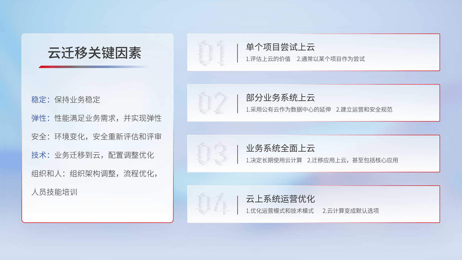 结合实际业务,,从规划设计、、、、云平台选型、、云原生改造、、、、数据迁移、、集成交付,,,,迁移全过程为客户识别最佳上云路径,,做好风险识别管理,,,,设计网络架构、、、身份权限、、、安全审计合规、、操作审计、、日志审计、、、、监控告警策略、、、、多站点容灾设计等,,,,对云上基础设施进行整体规划,,提升IT治理水平,,以满足弹性、、、高可用、、、、高性能的需求。。